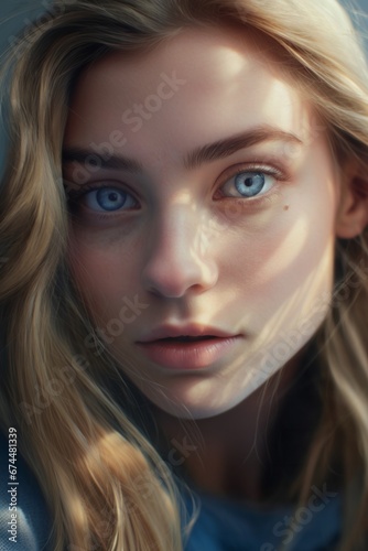 Close-up of the face of young woman with bright blue eyes and blonde, close-up of the face of European woman, the embodiment of genuine beauty