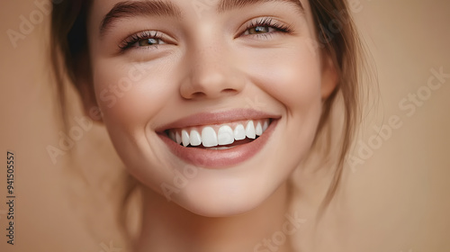 Closeup of woman smiling to camera, showing white smile of after teeth alignment procedure, beige background