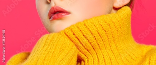 Close-up of yellow turtleneck and red lips child, horizontal, ideal for winter fashion, color trends, beauty campaigns and minimalist style content