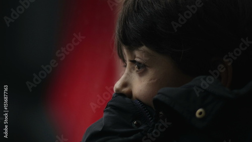 Close-up of young boy resting chin on jacket, staring at passing view outside moving bus, serious expression, quiet moment, lost in thought, deep contemplation