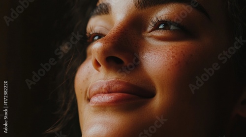 Close-up of young hispanic female with freckles and natural expression