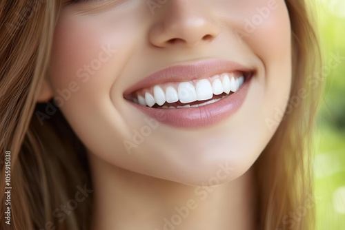 Close-up of young woman with glowing smile, white teeth, fresh outdoor background