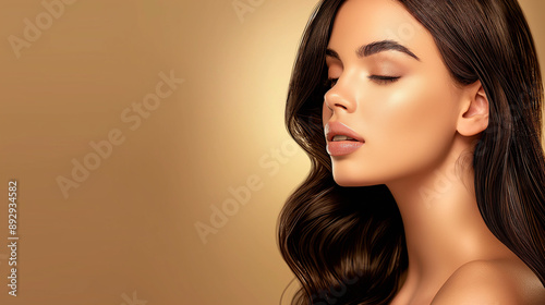 Close-up of young woman with long hair, beige background, serene expression, natural beauty, high-quality image, soft lighting, professional photography, elegant look, studio portrait