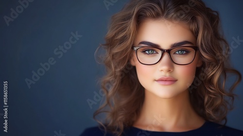 Close-up Photo: Confident Woman Gracefully Wearing Stylish Eyeglasses Against a Deep Blue Background. AI Generated
