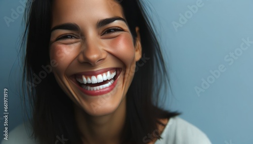 Close-up photo of a woman of Hispanic descent, her laughter emanating positivity and warmth. Her face, bright with delight