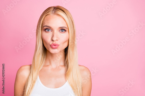 Closeup photo of amazing millennial lady sending air kisses to handsome guy using nude mate lipstick wear white tank-top isolated on pink color background