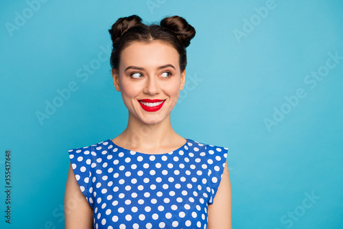 Closeup photo of amazing pretty buns lady toothy beaming smiling look side empty space red lipstick wear dotted white blouse shirt isolated blue color background