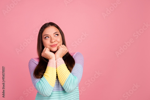 Closeup photo of amazing short hairdo lady looking up empty space deep thinking creative person arm on chin isolated pastel color background