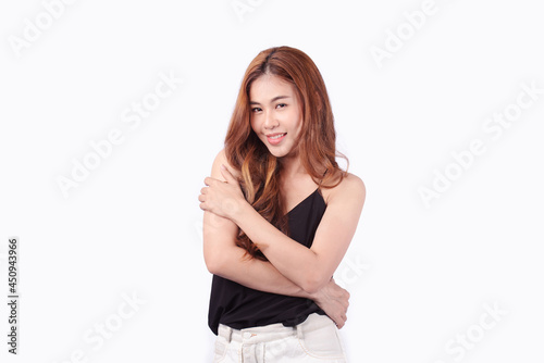 Close-up photo of an amazing long and sexy woman with long hair. Cute Asian woman smiling bright facial expression isolated on white background.