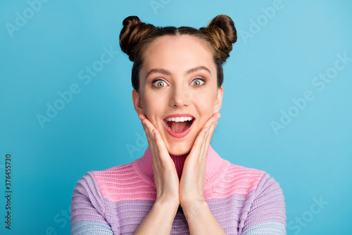 Closeup photo of attractive excited lady two funny buns open mouth good mood charming nice youngster hold arms on cheeks wear casual warm sweater isolated blue color background
