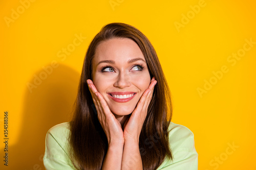 Closeup photo of attractive funny lady good mood arms on cheeks look side empty space interested adorable wear sweatshirt green sweater isolated vivid bright yellow color background