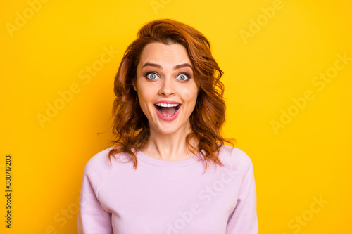 Closeup photo of beautiful pretty ginger lady open mouth listen cool good news enjoy unexpected surprise wear pink pullover shirt isolated yellow color background