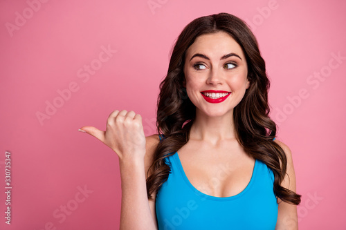 Closeup photo of crazy funny curly lady direct thumb finger side empty space show low prices advert banner sale offer wear casual blue singlet isolated pink color background