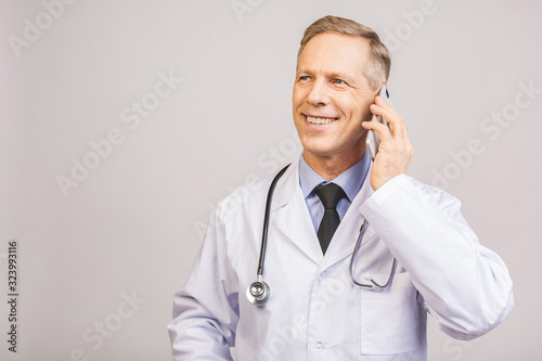 Closeup photo of senior man doctor standing isolated on grey background, using mobile phone.