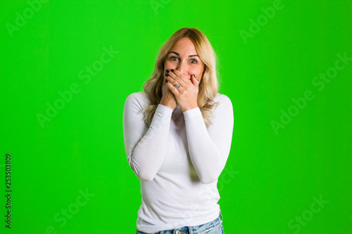 Close-up photo of surprised pretty young woman with opened mouth, touching her cheek, looking at camera