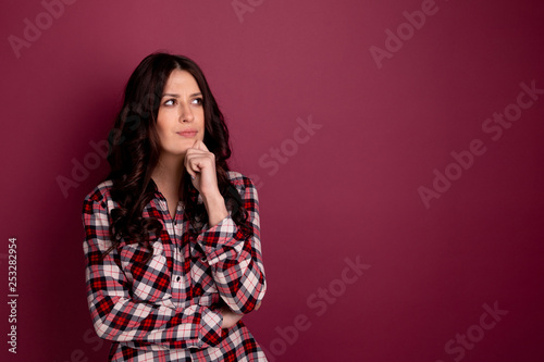 Closeup photo of thinking attractive woman posing isolated over the dark pink backgrownd