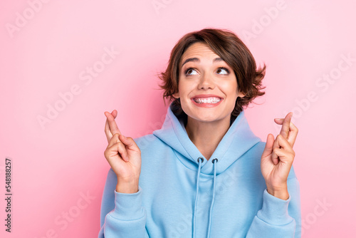 Closeup photo of young attractive nice perfect woman toothy smile please wish dreamy look empty space isolated on pink color background