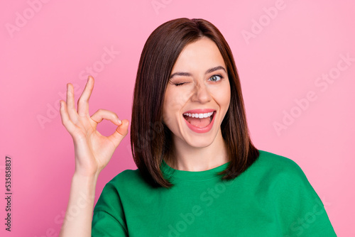 Closeup photo of young attractive woman showing okey sign blink flirty smiling isolated on pink color background