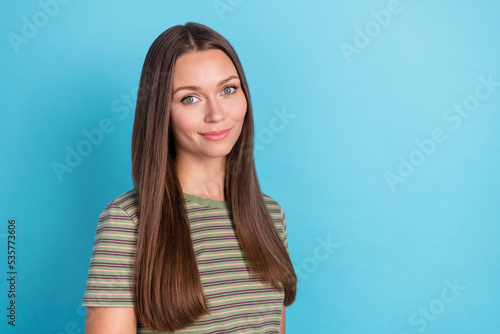 Closeup photo of young cute pretty woman wear stylish striped khaki t-shirt positive smile confident manager worker isolated on blue color background