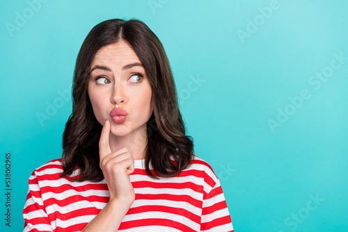 Closeup photo of young gorgeous woman wear striped t-shirt pouted lips kiss touch cheeks dreamy look empty space isolated on cyan color background