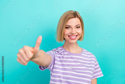 Closeup photo of young lady blonde hair wear trendy t-shirt thumb up feedback your job experience isolated on aquamarine color background