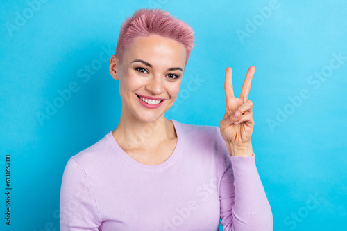 Closeup photo of young lady youngster saying hi to her mates fellows friends wear casual shirt isolated blue color background