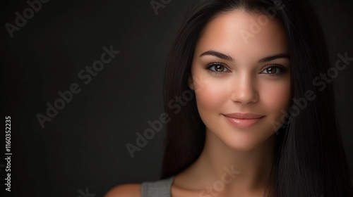 Close-up Photo: Serene Woman Smiling Gently Against Dark Background. AI Generated