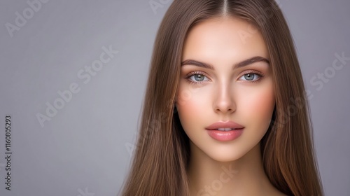 Close-up Photo: Serene Woman with Long Brown Hair Against a Soft Gray Background. AI Generated
