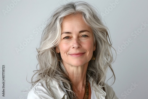 Close-up portrait of a beautiful senior woman smiling, with gray hair isolated on a clean background. Healthy face skin care beauty, skincare cosmetics concept.