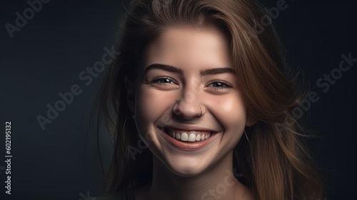 Closeup portrait of a beautiful smiling young woman on grey background.Generative Ai