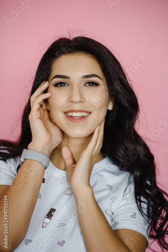 Close-up Portrait of a beautiful young girl, isolated on pink background. Studio shot. Photography of a Young smiling cute brunette in a white t-shirt on a pink background