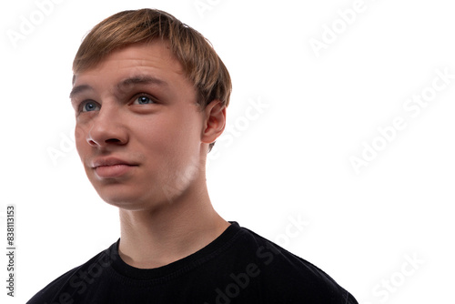 Close-up portrait of a blond 16 year old guy dressed in a black T-shirt against a background with copy space