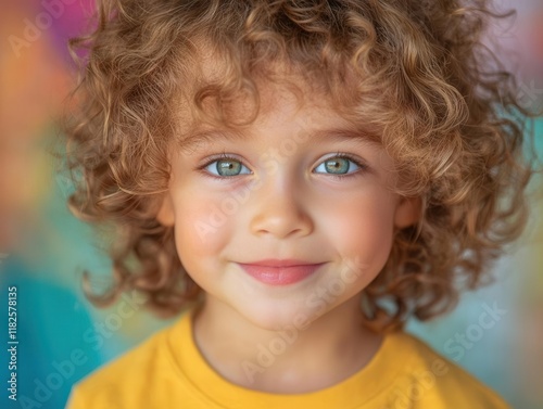 close-up portrait of a child with curly hair, showcasing innocence and joy. bright eyes and a radiant smile capture the essence of childhood, set against a colorful background