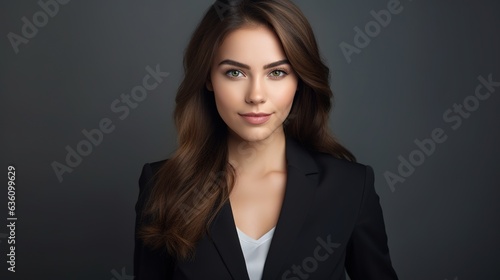Close-up portrait of a confident brunette businesswoman smiling in a studio