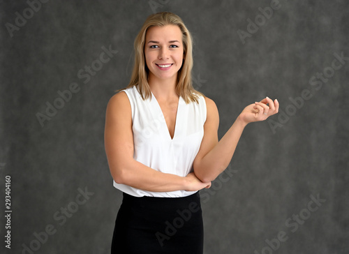 Close-up portrait of a cute caucasian blonde girl in a white blouse on a gray background. Wide smile, happiness. It is in different poses.