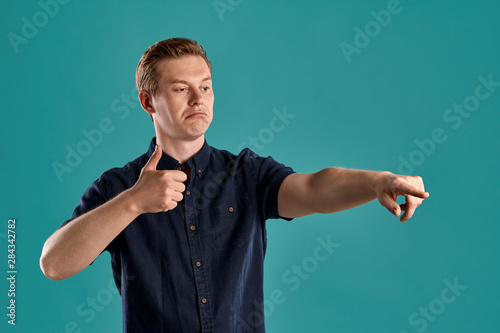 Close-up portrait of a ginger guy in navy t-shirt posing on blue background. Sincere emotions.