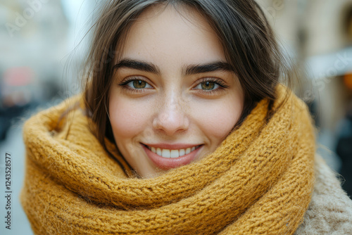Close-up portrait of a happy woman with green eyes and a warm scarf, enjoying a cold winter day outdoors.