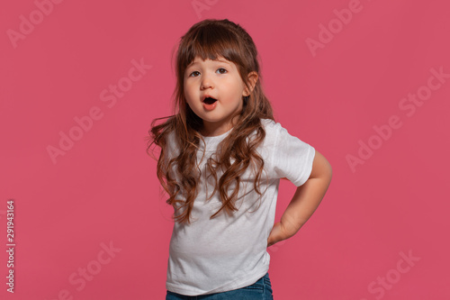 Close-up portrait of a little brunette girl dressed in a white t-shirt posing against a pink studio background. Sincere emotions concept.