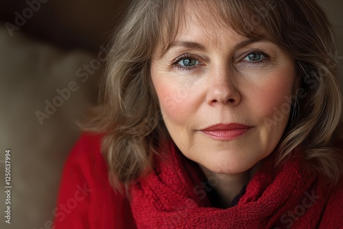 Close-up portrait of a mature woman in a red sweater. Ideal for articles on aging, beauty, or women's health.