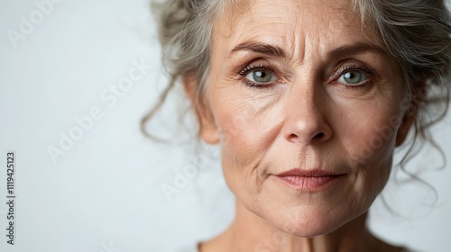 Close-up portrait of a mature woman with gray hair and expressive eyes.