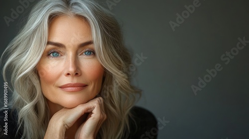 Close-up portrait of a mature woman with silver hair and blue eyes resting her chin on her hands, conveying calm and confidence against a dark background