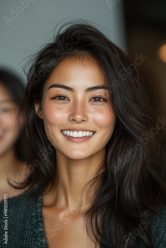 Close-up portrait of a smiling Asian woman with dark hair and natural beauty in a soft light setting