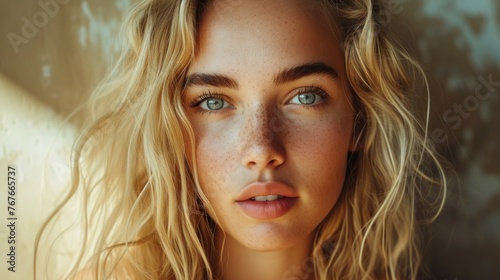 Close-up portrait of a smiling beautiful blonde caucasian woman with blue eyes, looking at camera, on a gray background with copy-space
