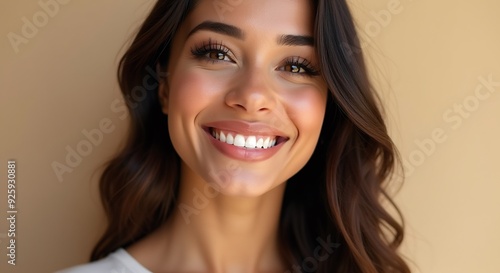 Close-up portrait of a smiling Hispanic woman, showcasing vibrant emotions, perfect for marketing, cultural events, beauty, and empowerment themes.
