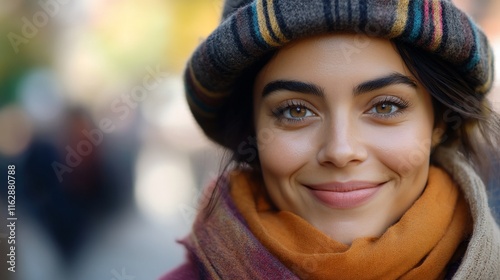 Close-up portrait of a smiling woman wearing a hat and scarf outdoors.