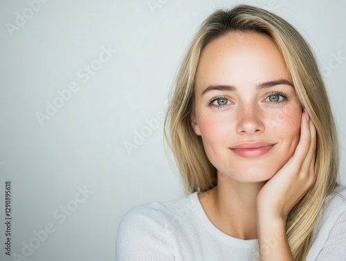 Close-up portrait of a smiling woman with blonde hair and green eyes, resting her face on her hand