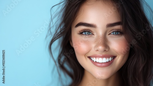 Close-up portrait of a smiling woman with blue eyes and freckles against a light blue background
