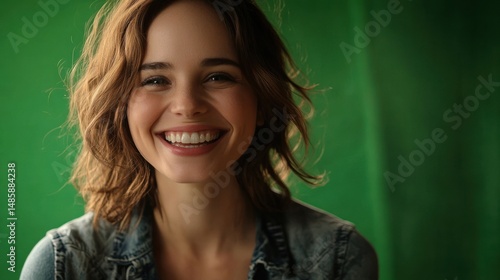 Close-up portrait of a smiling woman with wavy brown hair, against a green background