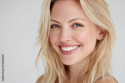 Close-up portrait of a smiling young woman with blonde hair and clear skin, natural makeup and bright white teeth, conveying warmth, confidence and approachable modern beauty.