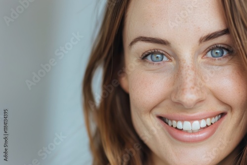 Close-Up Portrait of a Smiling Young Woman with Freckles and Bright Blue Eyes, Radiating Positivity and Confidence in Natural Light